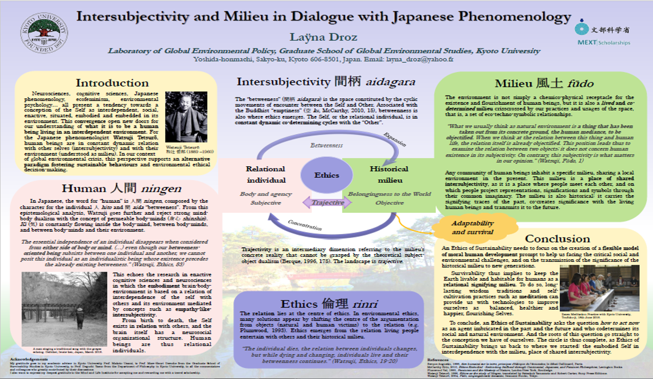 Poster presented and discussed at the Mind and Life Research Summer Institute, Garrisson Institute, New York City, USA. Droz, L. (2017, June). Intersubjectivity and Milieu in Dialogue with Japanese Phenomenology.