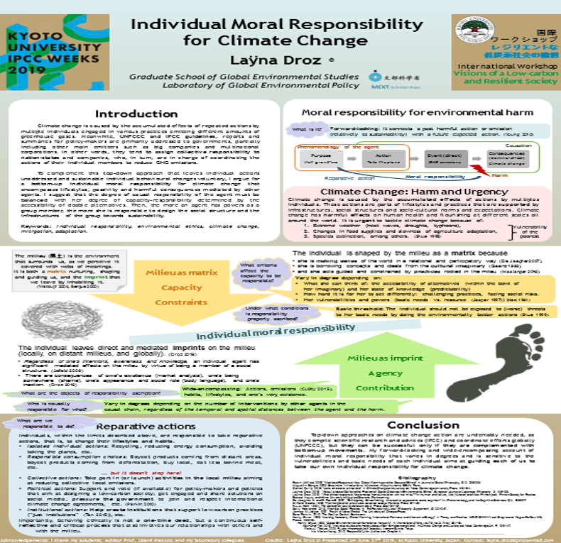 Poster presented at the IPCC Week, Kyoto University, International Workshop Visions of a Low-carbon and Resilient Society, June 27th, Kyoto, Japan. Citation: Droz, L. (2019, June) Individual Moral Responsibility for Climate Change