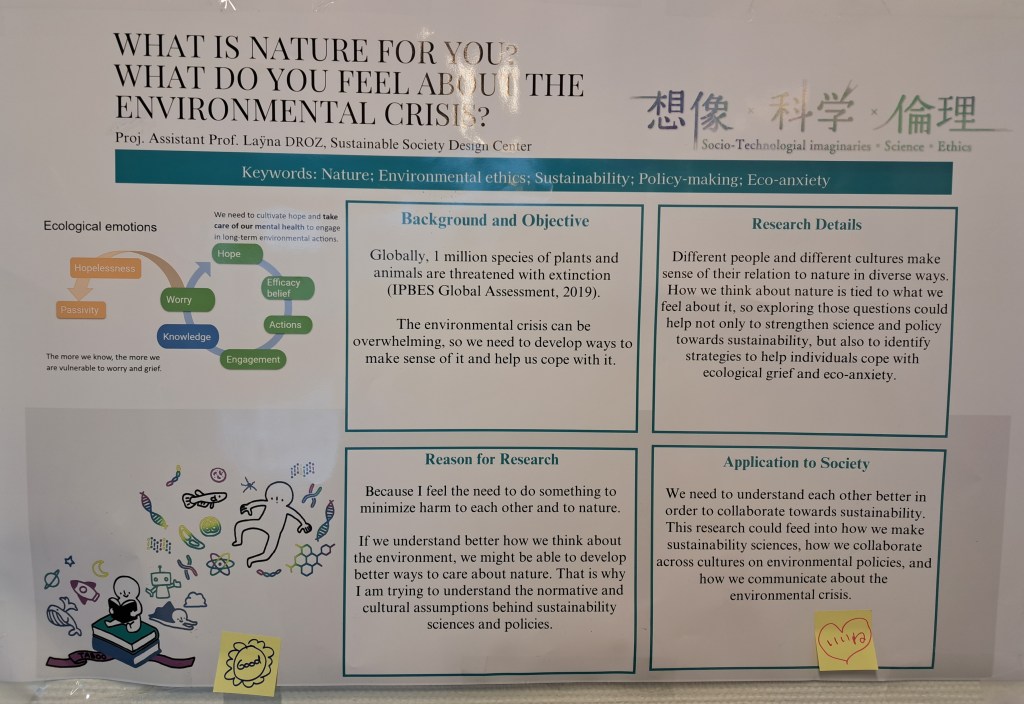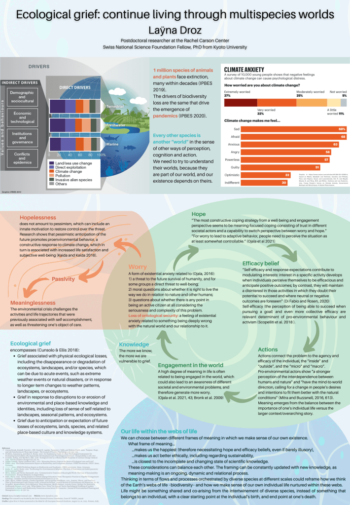 Droz, L. (2022, August) Ecological grief: continue living through multispecies societies, poster presented at the Mind and Life European Summer Research Institute, Institutio Lama Tzong Khapa, Italy.